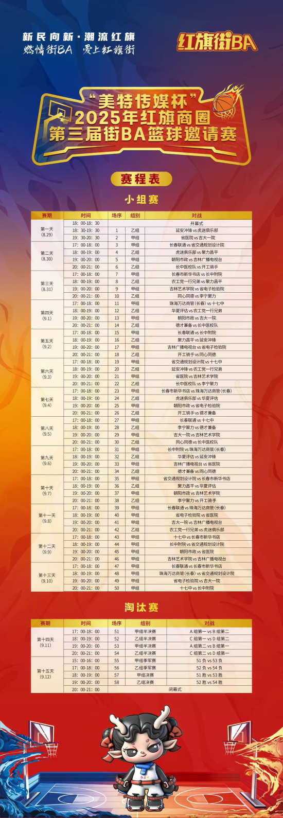 本届赛事以“燃情‘街BA’• 爱上红旗街”为主题,由吉林省篮球协会、长春市篮球协会指导,长春市朝阳区总工会、朝阳区文化和旅游局(体育局)、红旗街道办事处联合主办。赛事汇聚了机关企事业单位组的12支队伍和“三新”领域组的10支队伍,涵盖医疗、教育、企业、媒体等多个领域,特别值得一提的是,今年首次迎来了备受关注的新就业群体——骑手代表队。22支劲旅将展开激烈角逐。