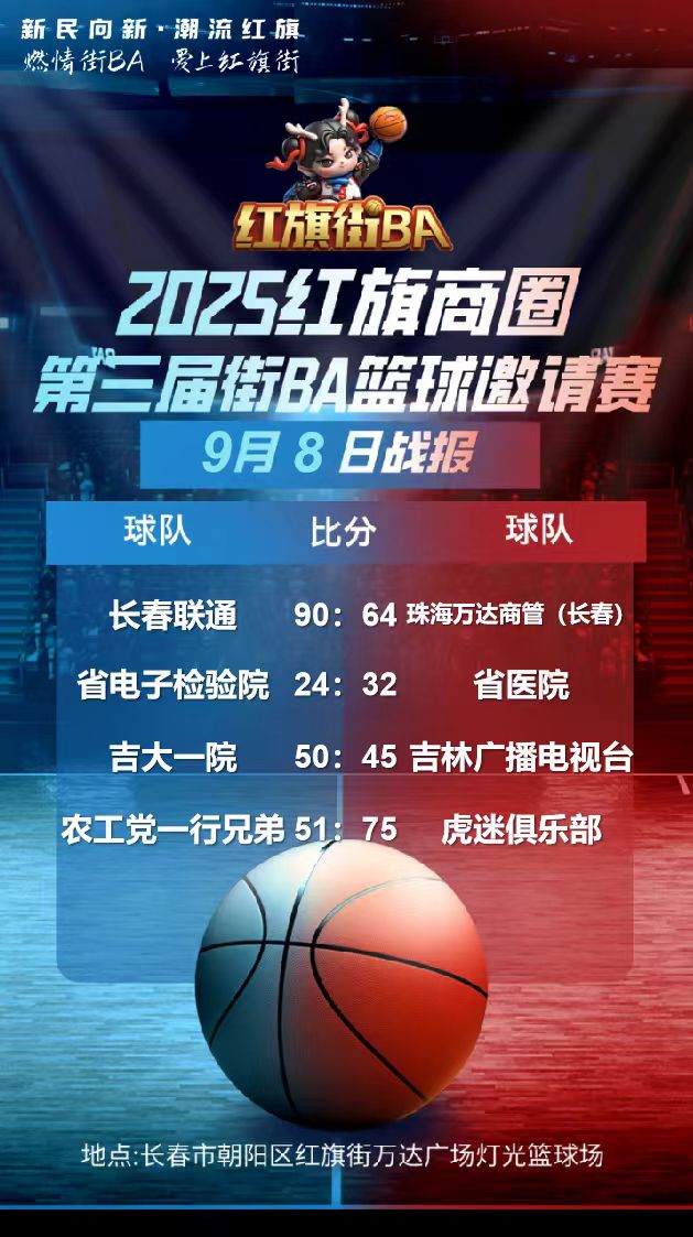 在8日比赛中,长春联通90:64珠海万达商管(长春)。省电子检验院24:32不敌省医院。