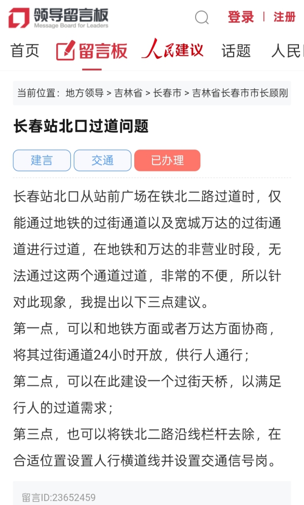 近日,有网友在人民网“领导留言板”上写道:长春站北口从站前广场在铁北二路过道时,仅能通过地铁的过街通道以及宽城万达的过街通道进行过道,在地铁和万达的非营业时段,无法通过这两个通道过道,非常不便。据此,网友提出三条建议,包括过街通道24小时开放、建过街天桥、去除栏杆等。