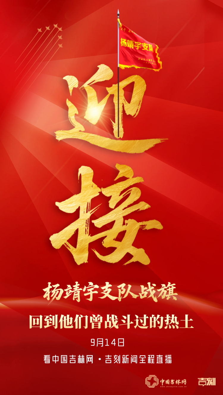 9月14日8:15-10:00,锁定中国吉林网·吉刻新闻直播间,关注吉林省迎接“杨靖宇支队”战旗特别直播,让我们共同迎接“杨靖宇支队”战旗荣归吉林,一起铭记历史,缅怀先烈,传承红色基因,汲取奋进力量!
