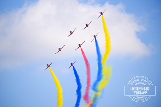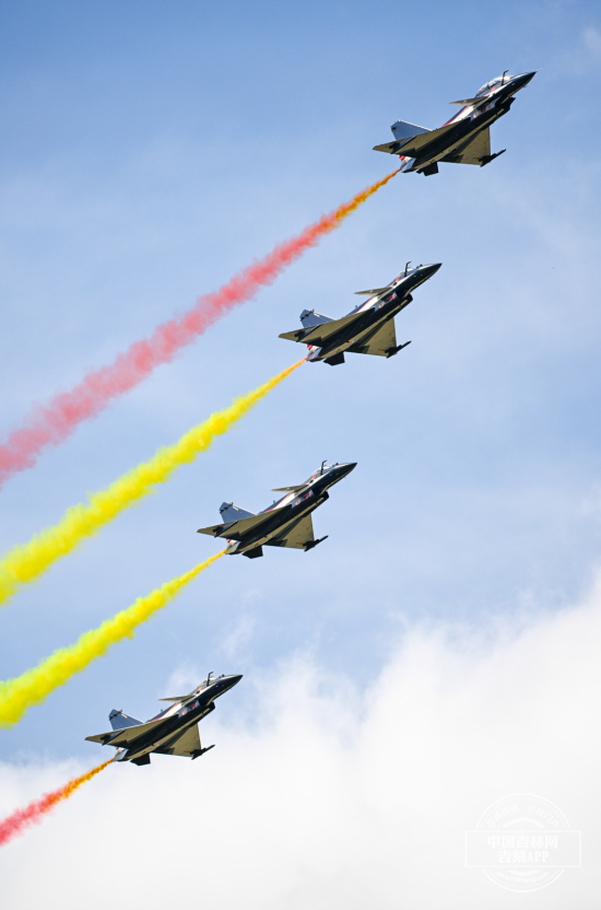 10时许,运20A、歼-16、空警-500、轰-6等战机先后起飞进行通场展示,来自“红鹰”飞行表演队的8架教-8飞机,带来19个特技动作表演,精湛的技术和胆识,展现空军官兵的勇敢与自信。