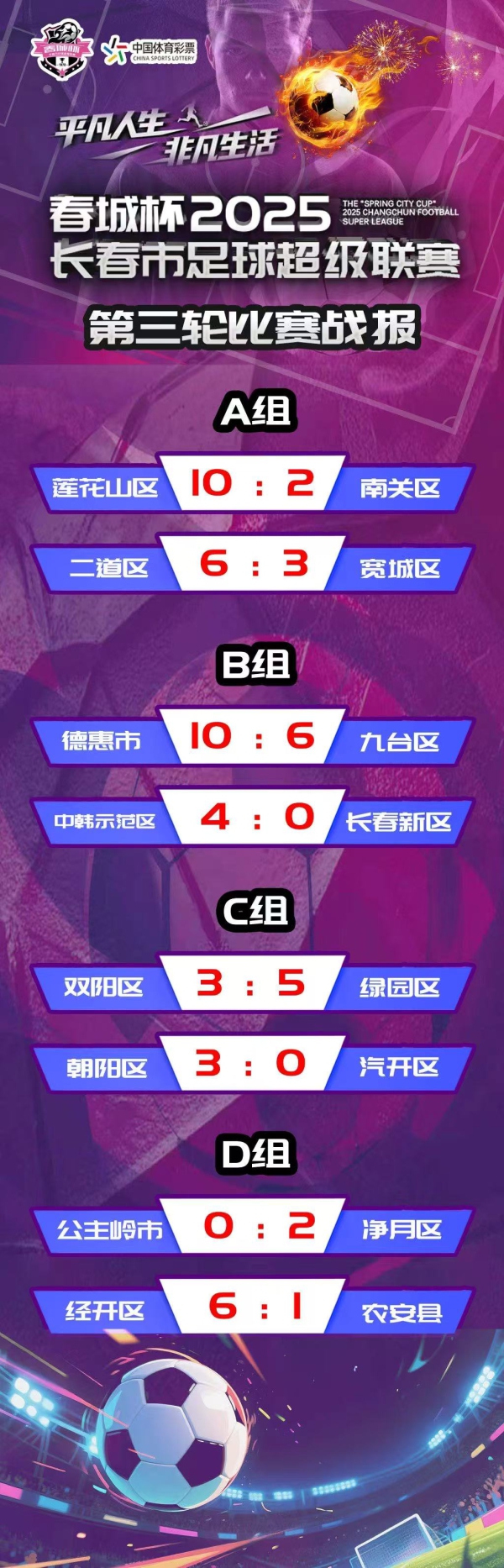 B组的中韩示范区更是零封对手,4:0完胜长春新区,稳稳拿下关键积分;C组的绿园区延续强势,5:3战胜双阳区,进一步巩固小组优势;D组的经开区则以6:1大胜农安县,展现出不俗的竞技状态。