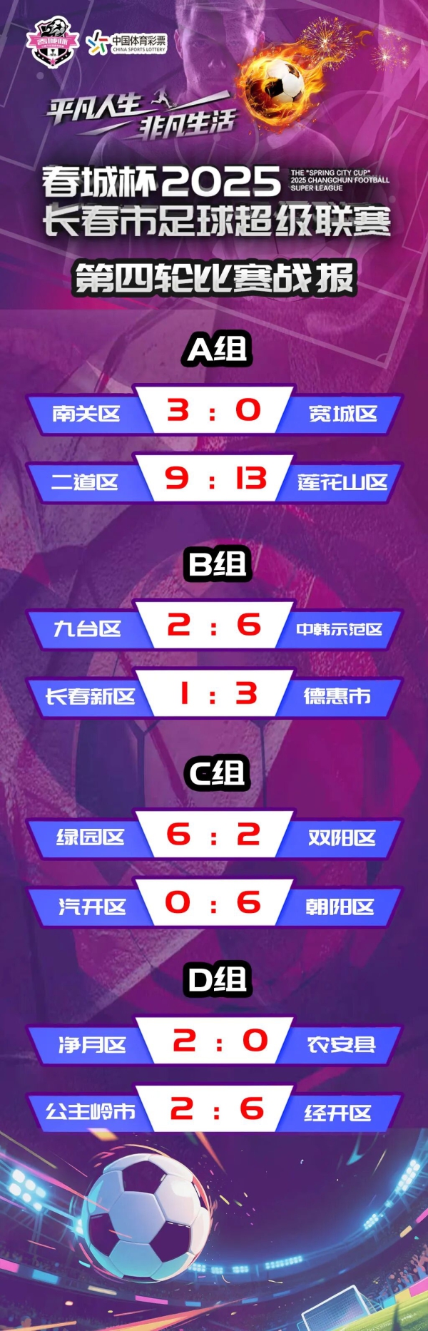 第四轮赛事竞争更为激烈,甚至出现多场冷门与高比分对决。A组的莲花山区与二道区上演进球大战,并最终以13:9击败二道区,成为本轮最大亮点;B组的中韩示范区再传捷报,6:2击败九台区,豪取连胜;C组的朝阳区表现抢眼,6:0零封汽开区,绿园区也以6:2轻取双阳区;D组的经开区延续胜势,6:2战胜公主岭市,净月区则2球击败农安县,稳居小组前列。