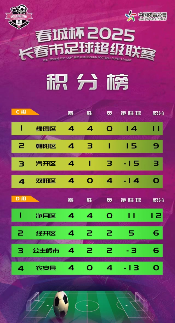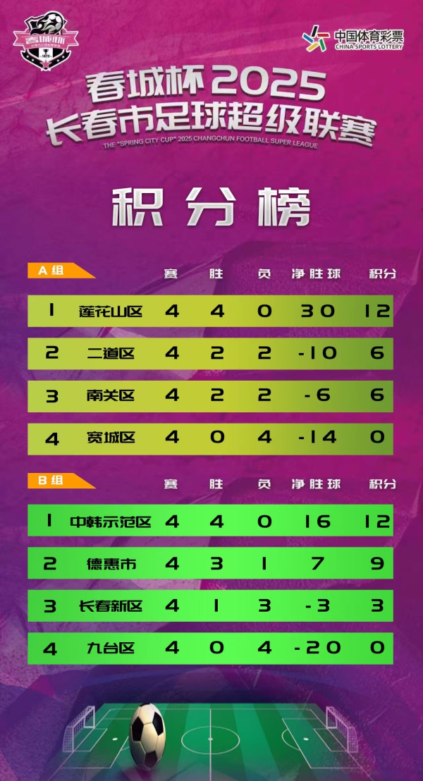 积分榜方面,四个小组的第一名分别为A组莲花山区、B组中韩示范区、C组绿园区、D组净月区,四队均保持不败。