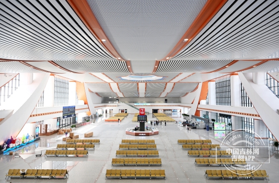从外观望去,站房外立面以长白山为原型,“山脉、雪松、冰挂、冰花”等元素巧妙点缀,中央大面积玻璃幕墙如天池般澄澈,倒映天光云影;两侧白色曲面幕墙形似覆雪山峦,恢宏大气,仿佛将长白山的壮阔景致浓缩于建筑之上。