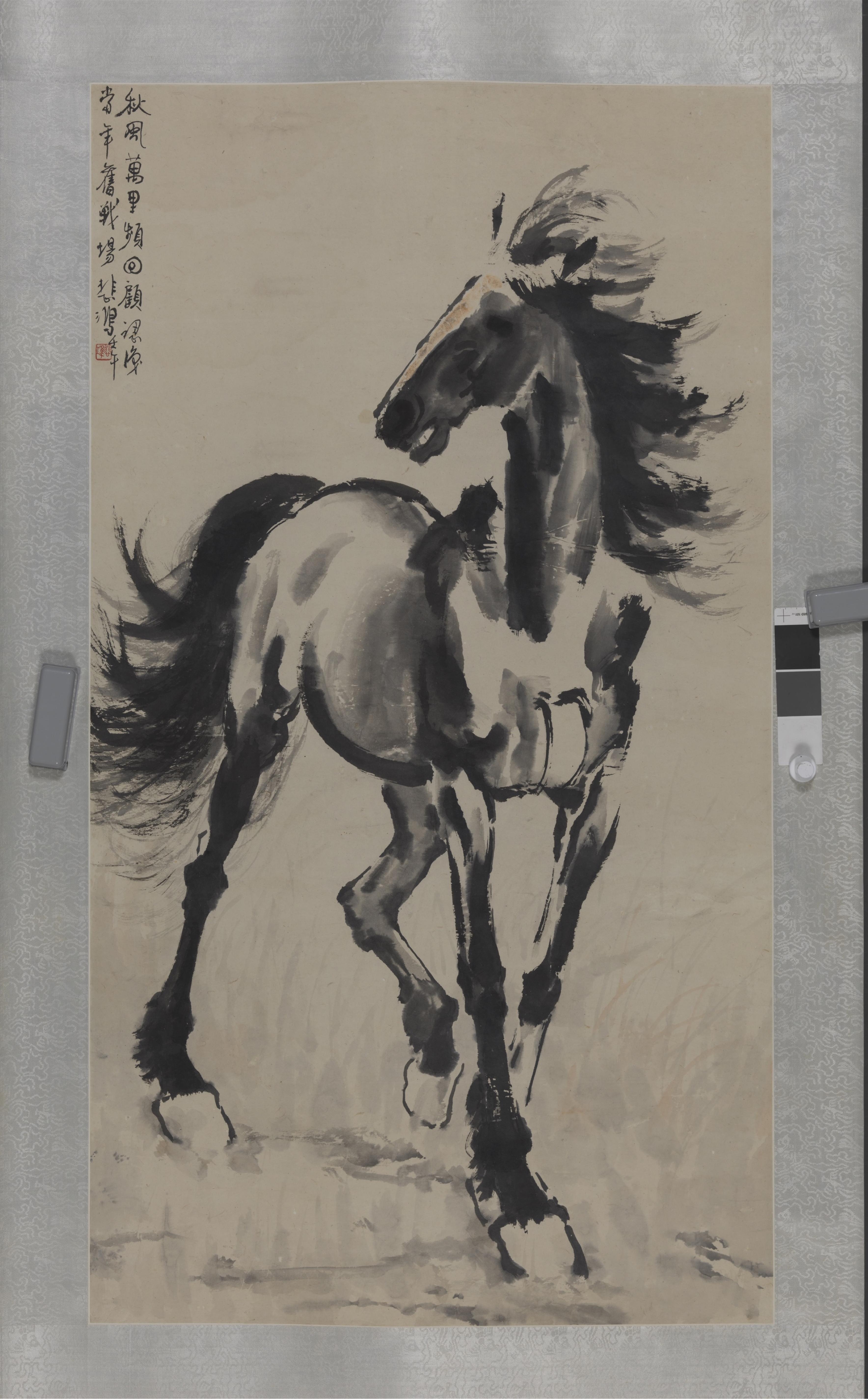 一代大师徐悲鸿开创性地将西画的光影、严谨造型,以及明暗关系融入中国画笔墨,创作了这幅《战马》,用写意形式呈现,完善并严谨了中国画造型。借瘦骨嶙峋却昂扬、有嘶吼感的战马形象,传递中国人奋力拼搏、不屈不挠的人文精神,体现其爱国情怀。至今看来,依然能让人感受到那种震撼人心的力量与豪情。