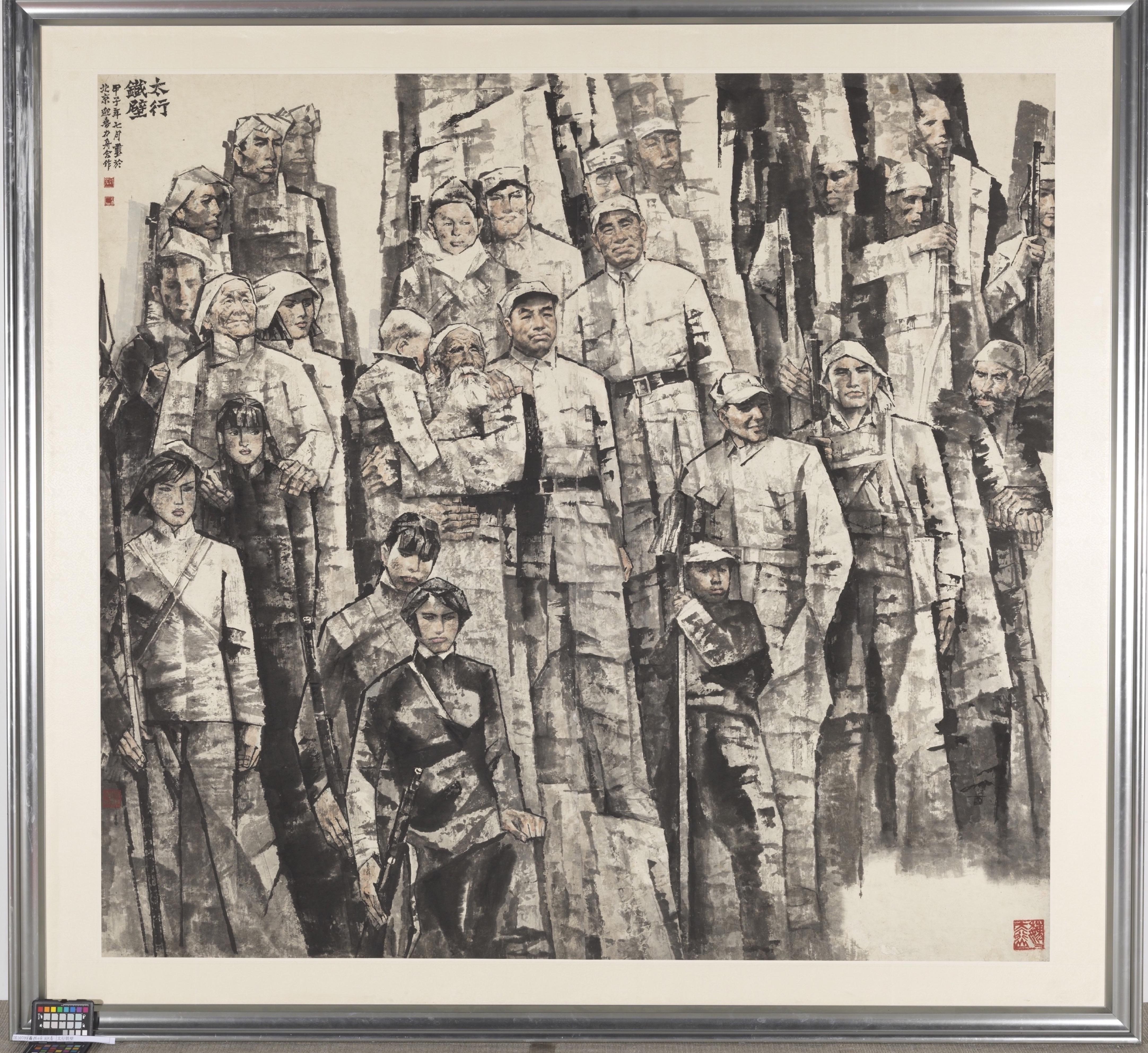 又一幅取材于太行山的作品,创作者王迎春、杨力舟历时八九年时间在太行山调查、研究、体验,从军民鱼水情深,携手并肩如铜墙铁壁般共同抵御外辱的历史中孕育出这幅《太行铁壁》。画面中黄崖洞群峰壁立如雕塑,高度概括的人物形象与背景的山石融为一体,寓意不可战胜的人民力量。运用大小斧劈皴法塑造出太行铁壁、坚不可摧的精神象征,成功的刻画使作品荣获第六届全国美展金奖。