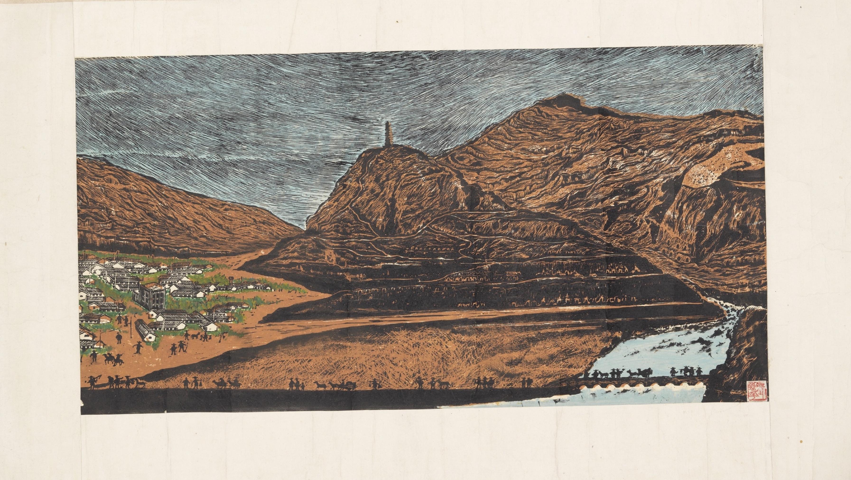 版画《延安》展现延安宝塔山下的革命圣地风貌。画面中宝塔矗立,延河环绕,窑洞层叠,群众行进,晨光初照,万物苏醒。采用“高远”视角,层层推进,体现对革命源头的追思。