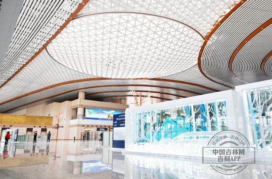 走进长白山站大厅,处处体现着绿色、自然,抬头可以看到候车大厅内饰采用中央圆形水滴形吊顶设计,结合“天池水滴”与条纹吊顶的“海东青”展翅造型,形成晶莹剔透的整体形象,整体以“三江之源”为设计理念。