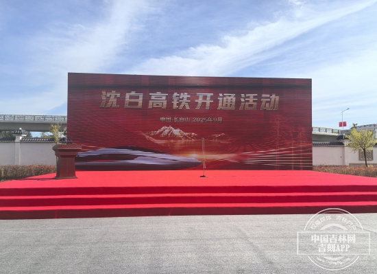 在1号站台,记者看到,沈白高铁开通仪式现场已经布置完毕。工作人员也在紧张忙碌,为明天沈白高铁开通做最后的准备。