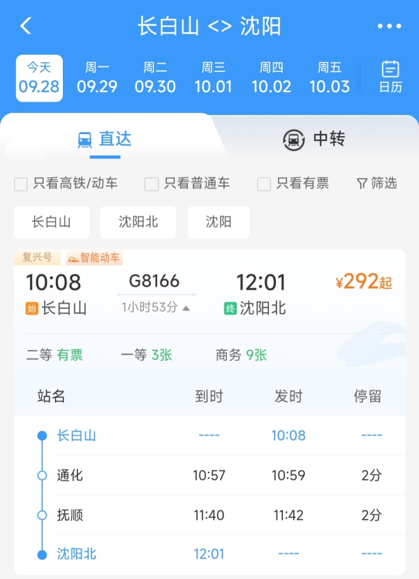 沈白高铁今日(2025年9月28日)开通运营,长白山站于10点08分发出的首趟列车为G8166次,途经通化站、抚顺站,终点站为沈阳北,到达时间为12点01分,总时长为1小时53分钟。