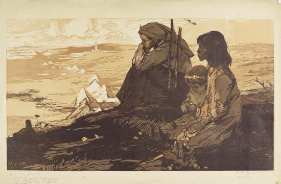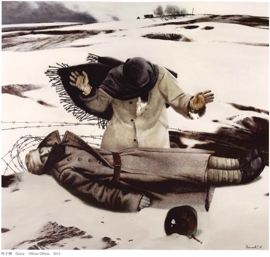 作者将战争带来的创伤具象化,把画面定格在了一对母子上。母亲用头巾遮面,难掩悲痛,跪倒在儿子冻僵的尸体前。她那颤抖的双臂、龟裂的手掌,让观者直观感受丧子的锥心之痛。裹身的军装、滚落的钢盔、坚硬的铁丝等战争符号揭示了故事背景。这张作品是千万家庭苦难的缩影,可见宏大战争中的个体悲剧感。