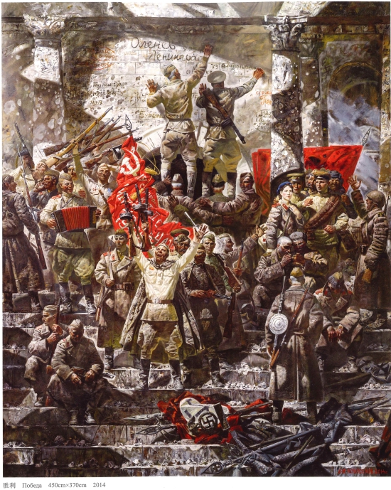 作品4.5米高,3.7米宽,讲述的是攻克柏林战役结束后胜利的场面,画面下方倒地的纳粹旗帜昭示了苏联军民以鲜血铺成的抗战之路,终于在攻占纳粹德国的核心首府中宣告结束。这场伟大的胜利将大家紧密地团结在一起,画面中心的士兵振臂高呼,整体洋溢着欢快的氛围。
