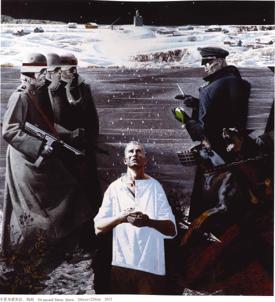 这幅作品与《胜利》体现了完全不同的一种心境。画中,一群纳粹官兵正欲枪决一名青年,青年正默默祈祷着。作者用灰冷的色彩刻画出纳粹官兵的冷血、暴戾,反衬出白衣士兵的的勇毅、悲悯。另一方面,眼睛被称作是“心灵的窗户”,画面中纳粹官兵的眼睛被遮挡,白衣士兵的眼睛中则充满情感,二者形成强烈反差。此外,旁边纳粹军官在处决现场悠然地削苹果——这种“杀戮与日常”的戏谑对比,更显露法西斯侵略者的疯狂。