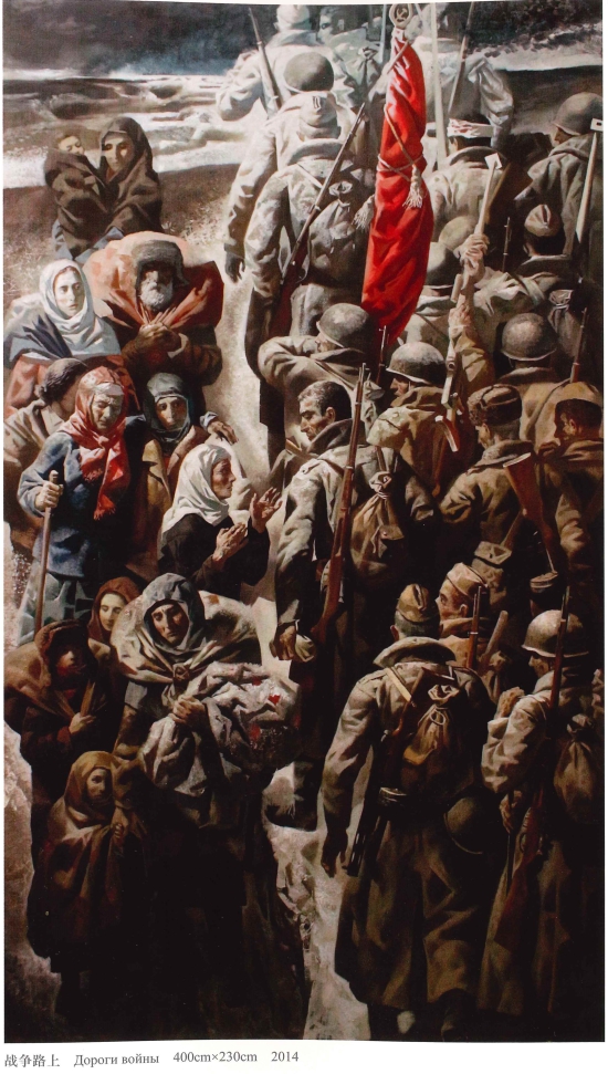 作品描绘了战争中的行军、撤退、逃亡或补给线场景,聚焦于士兵或平民在战争路上的艰辛、疲惫、坚韧与牺牲。作品延续了俄罗斯战争绘画传统的风格,致力于表现战争的苦难与人性的坚韧。