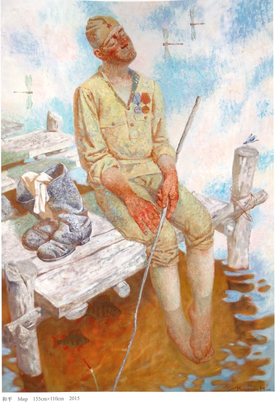 “和平”是艺术家创作的一个经典且永恒的主题,作品中一位老兵在河岸边仰望天空,期盼和平。
