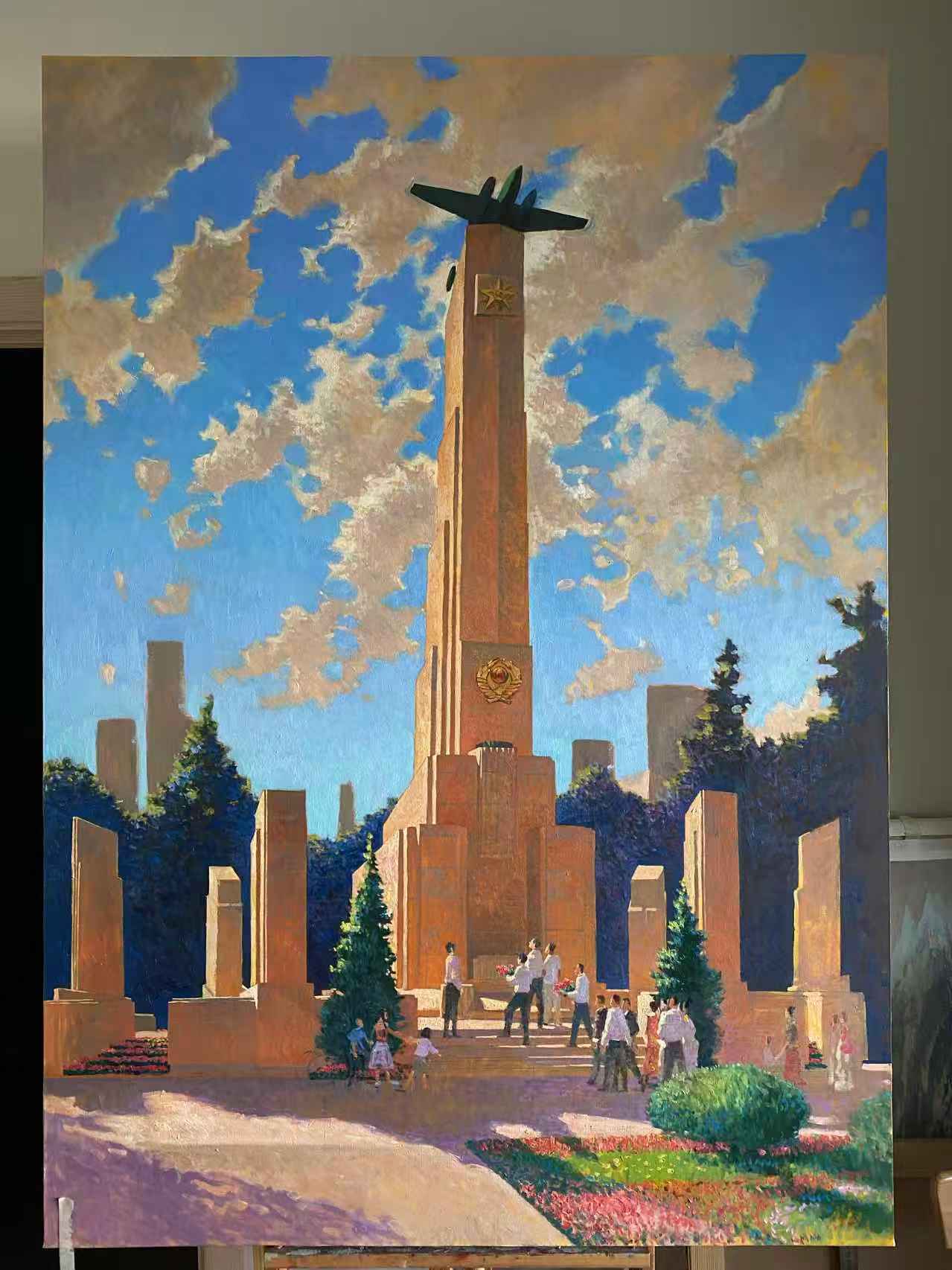 这是俄罗斯艺术家尼基塔·门捷列夫采夫的作品,取景于长春人民熟悉的人民广场。坐落在广场中心的苏联红军烈士纪念塔,于1945年11月建成,是长春市标志性建筑之一。1945年8月8日,苏联宣布对日作战,成为世界反法西斯战争的关键节点。苏军迅速进入中国东北,向日本关东军发起大规模进攻,许多战士将生命永远留在了这片土地。日本战败投降后,这里竖立起苏联红军烈士纪念塔,缅怀为支援东北人民抗击侵略者而英勇牺牲的苏联红军烈士。创作这一主题表达对先烈的敬意和怀念。