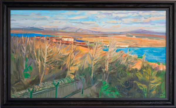 此作以山水意象表现东北地域精神。画面中松花江蜿蜒,长白山云雾缭绕,江畔隐约可见历史建筑与现代桥梁;构图融合传统山水布局与现实景观。光影柔和,色彩以青绿为主,体现地域特色。作为“地域记忆”代表采夫作,它将自然景观与历史文脉结合,体现“山河永固”的文化信念。