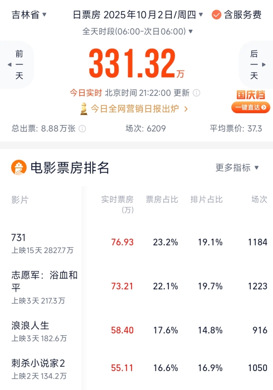 在吉林省观众观影热情依旧不减,10月2日收获330多万票房。而吉林观众最爱的电影非《731》莫属,它成为国庆第二日的吉林省票房冠军。
