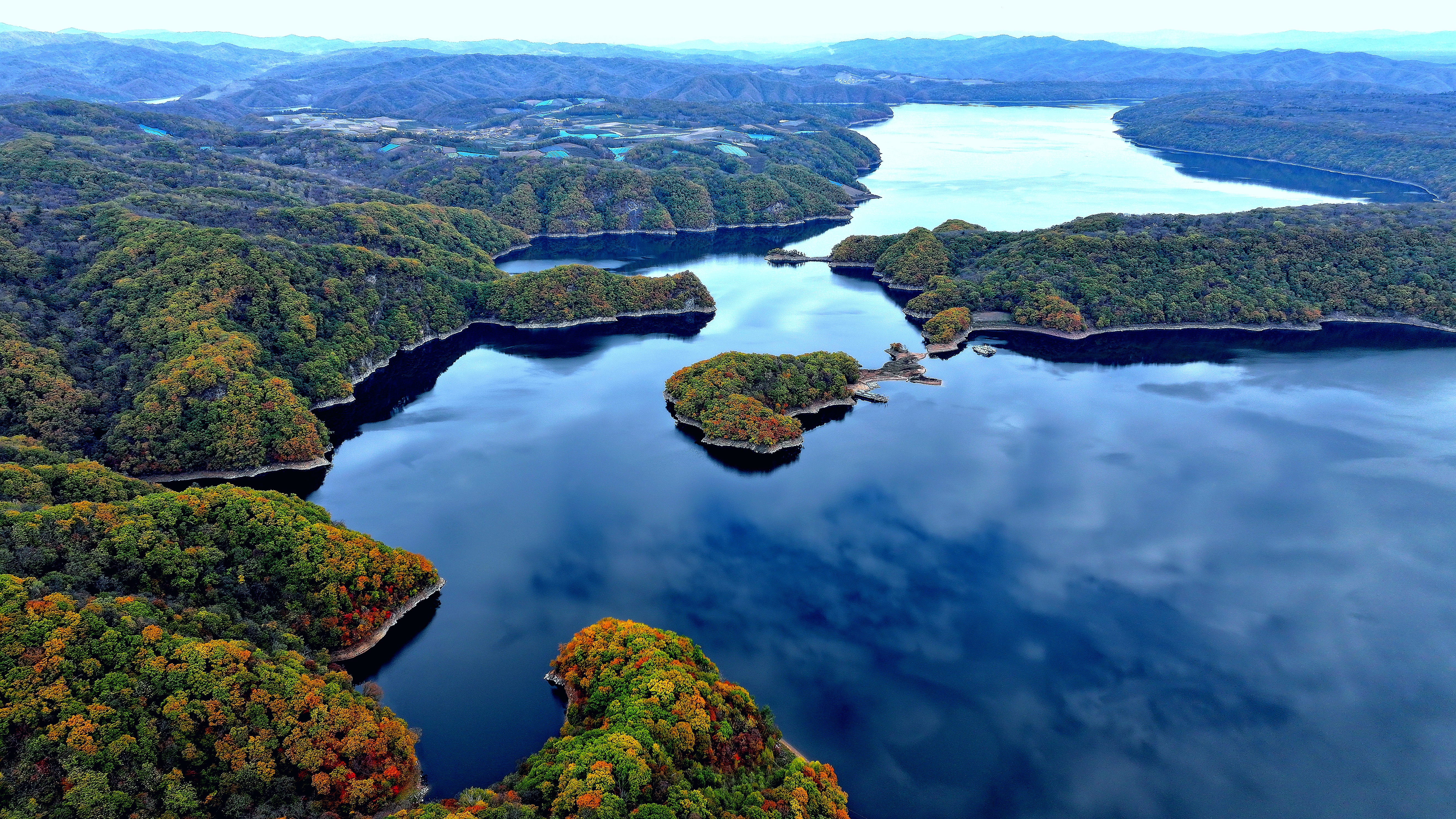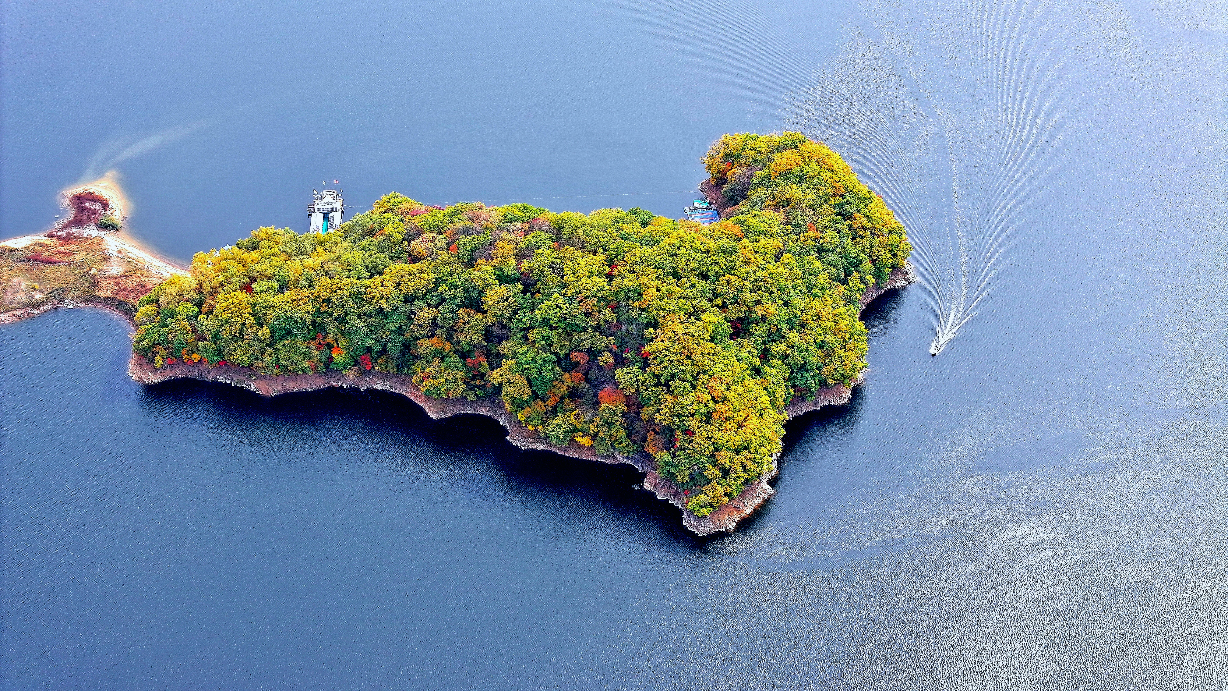 漫山的枫叶染上红与黄,斑斓的色彩与碧绿的江水相映成趣,构成一幅浓墨重彩的天然油画。
