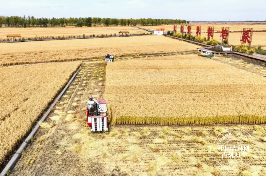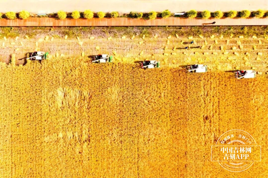 数十台收割机隆隆作响,在金色的稻浪中来回穿梭