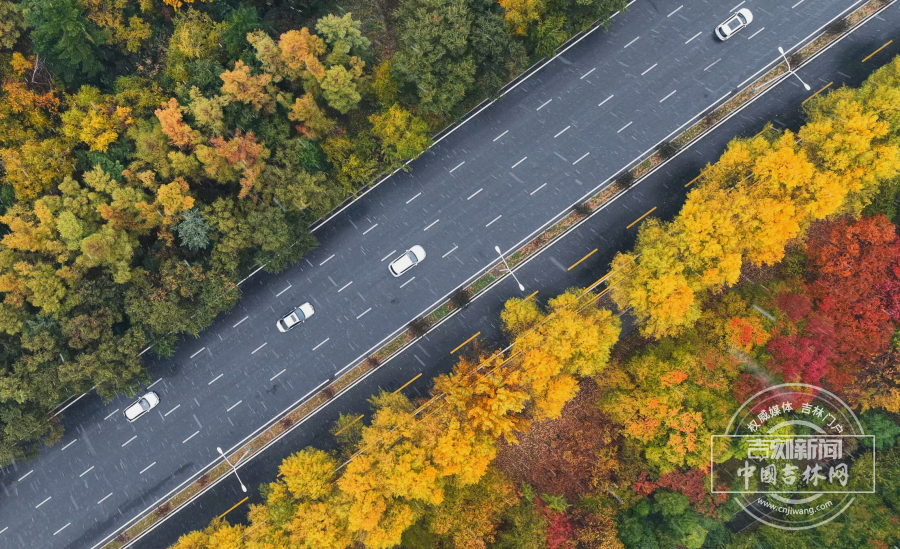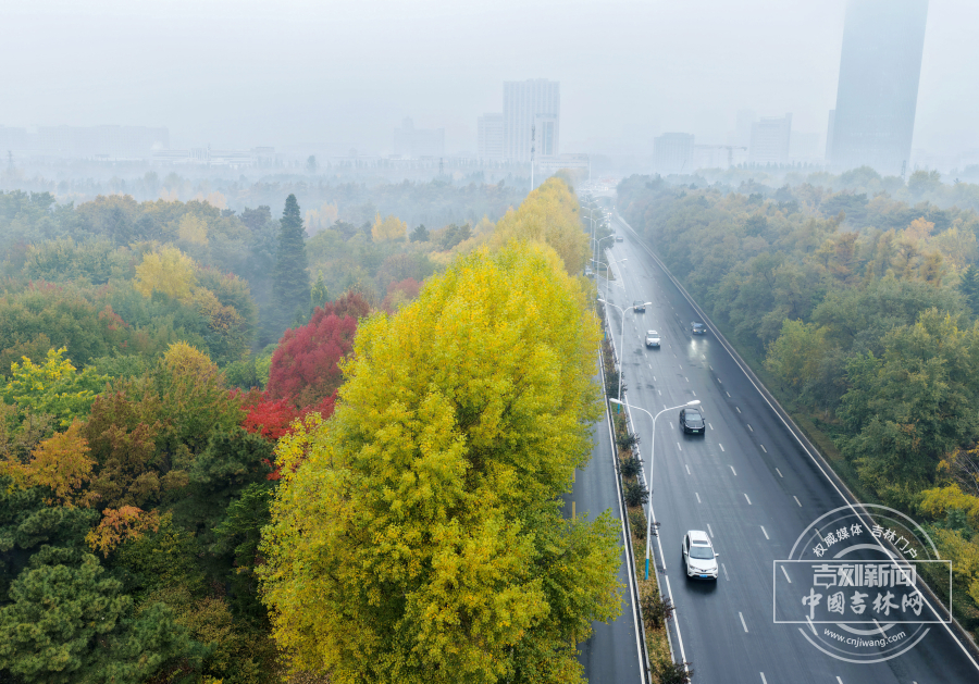 10月17日,正值秋天的长春迎来雨夹雪天气,雨雪与金黄的树木交织形成独特景观。