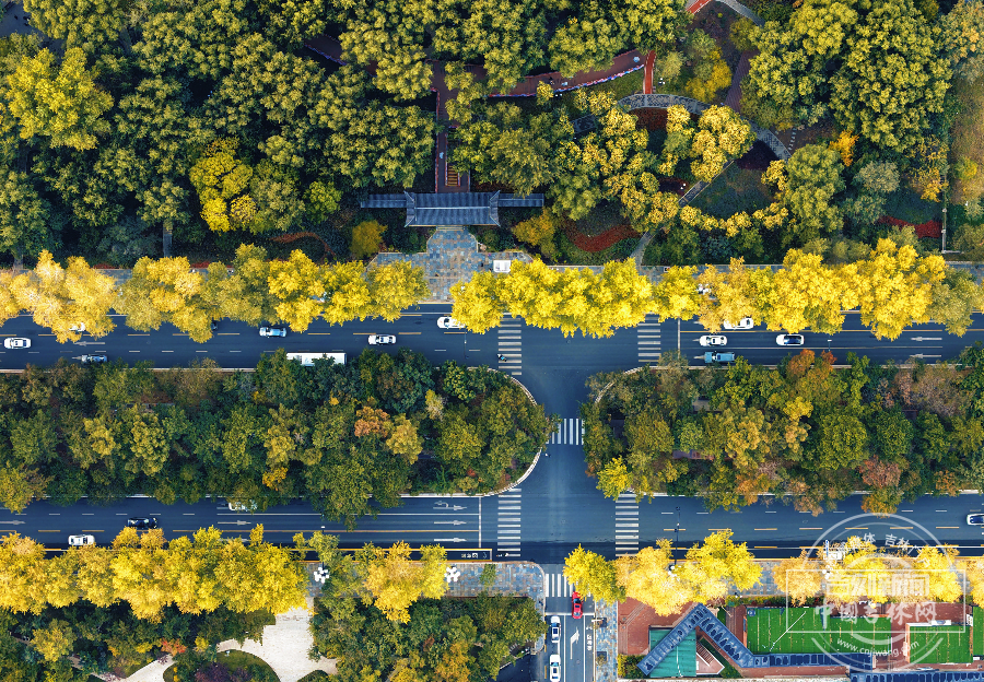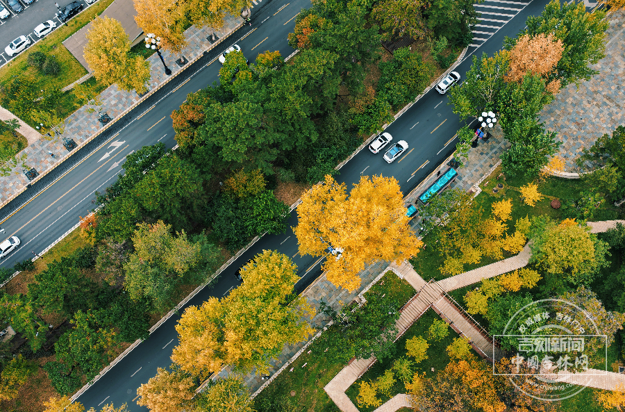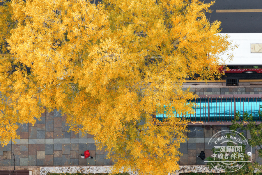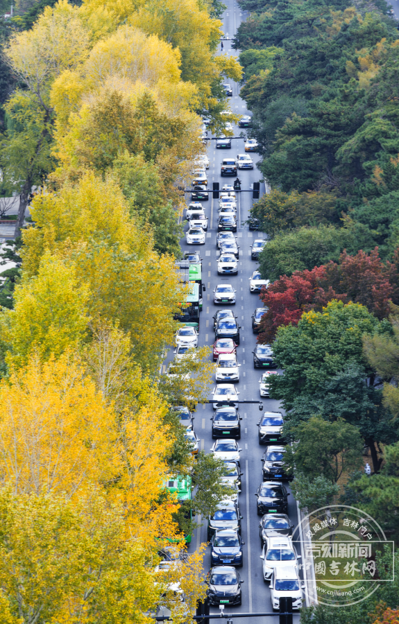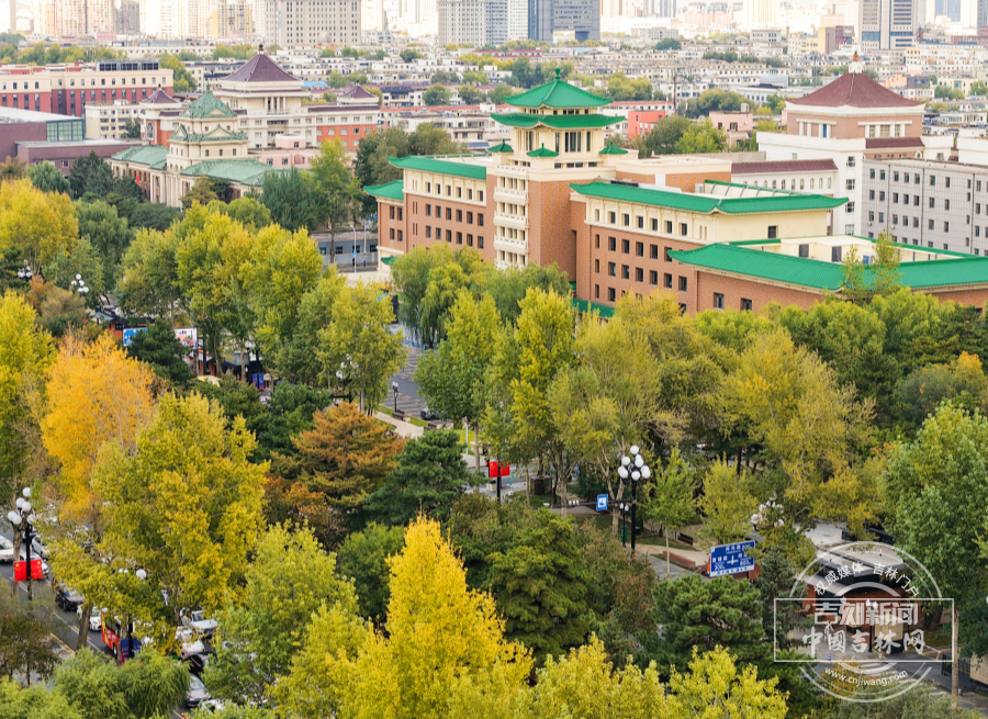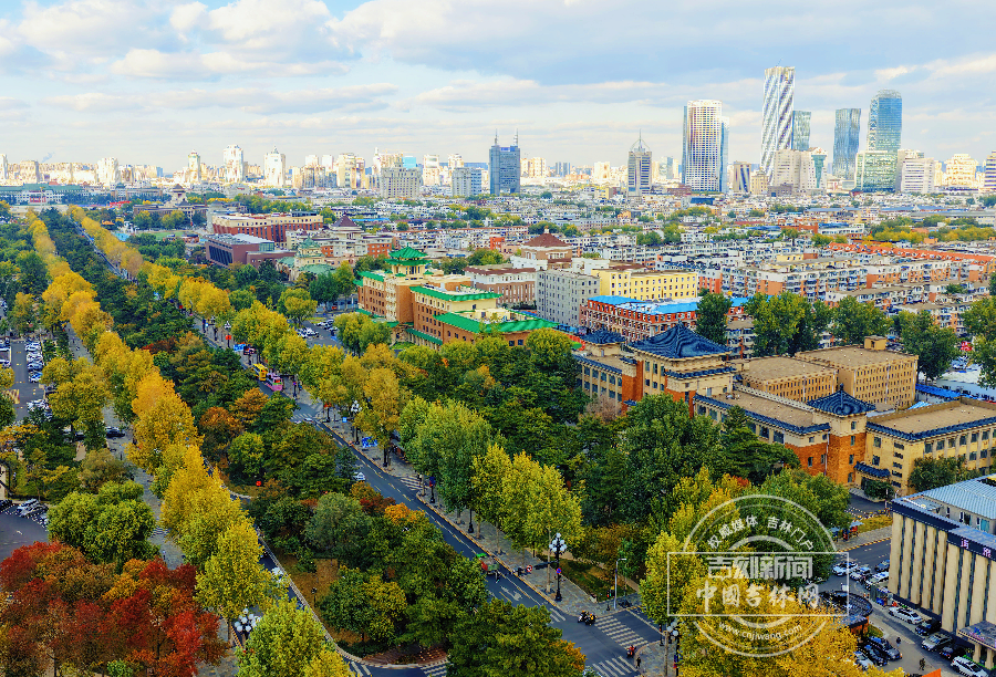 10月18日,入秋的长春新民大街,树木呈现黄绿红等交织的色调,街道两侧的历史建筑与周围的秋色形成了如画般的独特美景。