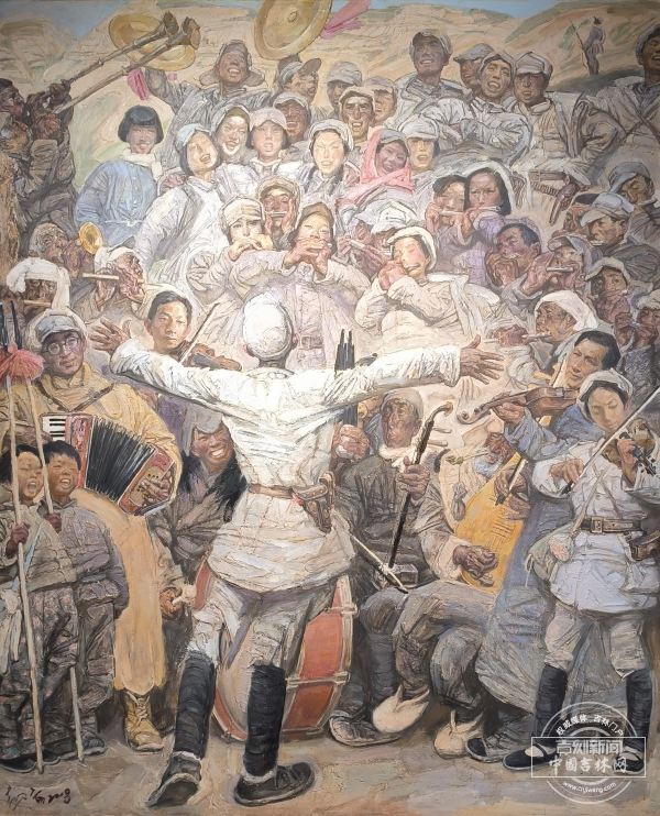 作品创意来源于冼星海创作的同名抗战歌曲,画面描绘了姿态各异的八路军战士们和群众站在高坡上,用乐器伴奏,合唱《在太行山上》的场景。