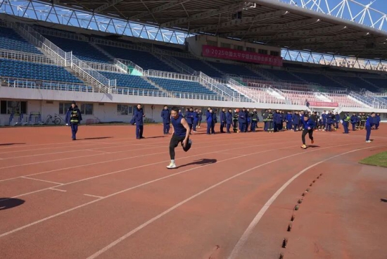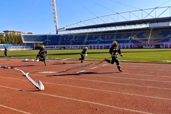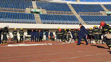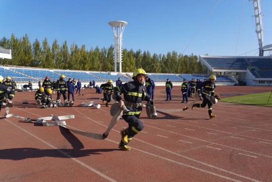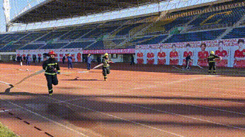 在小型站组竞技区则聚焦初期火灾扑救“小、灵、快”的处置特点,设置了400米跑、一人三盘水带连接、两人五盘水带操等紧贴实战需要的基础科目。400米跑科目中,参赛队员如离弦之箭,风驰电掣,在跑道上划出一道道蓝色闪电,这是体能与爆发的考验;一人三盘水带连接操中,甩开水带、连接接口、冲过终点,动作行云流水、节奏把控到位,这是精准与效率的较量;两人五盘水带操科目中,一人负责铺设干线,一人精准连接分水器与支线水带,灭火战线在他们手中快速形成,这是协作与默契的角逐。