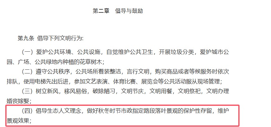 《条例》中提到,倡导生态人文理念,做好秋冬时节市政指定路段落叶景观的保护性存留,维护景观效果。