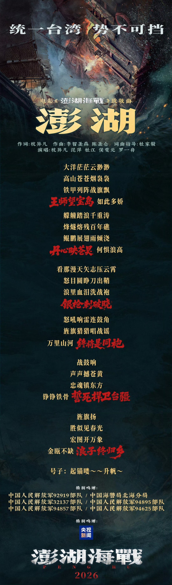 电影《澎湖海战》由王海峰任总制片人,郑保瑞监制并执导,杜家毅监制并编剧,王学圻、杜江、侯雯元、罗一舟领衔主演,易烊千玺特别主演,电影将于2026年上映。