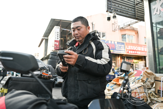 “冬天冷,手机得护着。” 他从摩托车上拿下透明包包着的手机,“我这是给手机保暖的,怕手机冻没电了。”张伟建笑着说着自己的手机“玄机”。从包里拿出手机,手机后盖全是蛛网状的裂纹,“这也赖我自己,刚买第一天,放在兜里就被硌坏了!”这时候,市场里的人渐渐多起来,认识他的人,总会笑着跟他打声招呼。他在这里工作已经是第十个年头了,期间开过店、打过工,现在的工作就是给市场里的商户送货,谁家需要送货,一个电话,他马上到位。