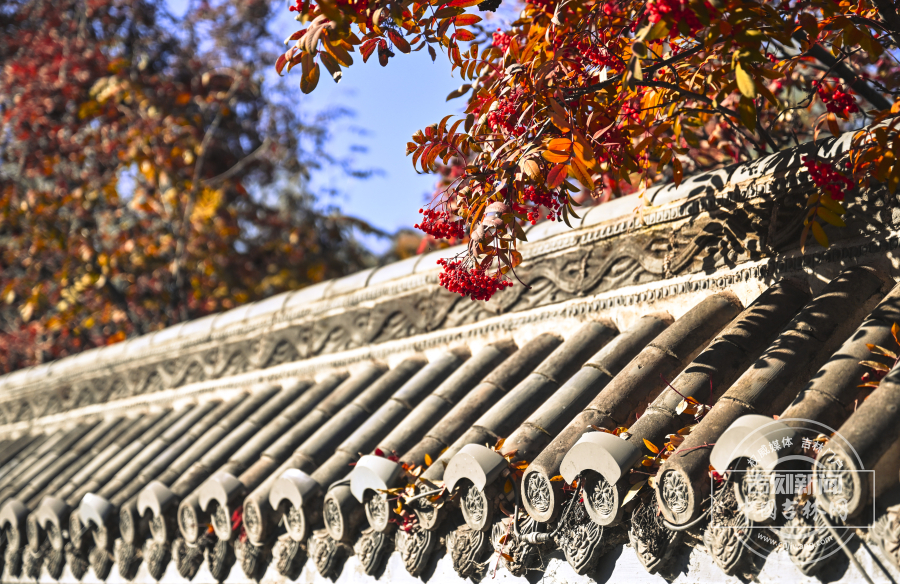 红色、黄色、绿色的树叶交织在一起,与古典建筑的飞檐翘角共同构成一幅诗意画卷。