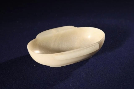 这件白玉耳杯以新疆和田白玉雕琢而成,莹润的玉质历经千年仍洁白如初,椭圆形杯身搭配半月形耳翅,形似飞鸟展翼,尽显灵动雅致。汉代耳杯多为漆器或陶制,玉质耳杯极为罕见,这件珍品不仅填补了东北地区高等级汉代玉器的考古空白,更被推测为中央王朝馈赠的外交重礼。