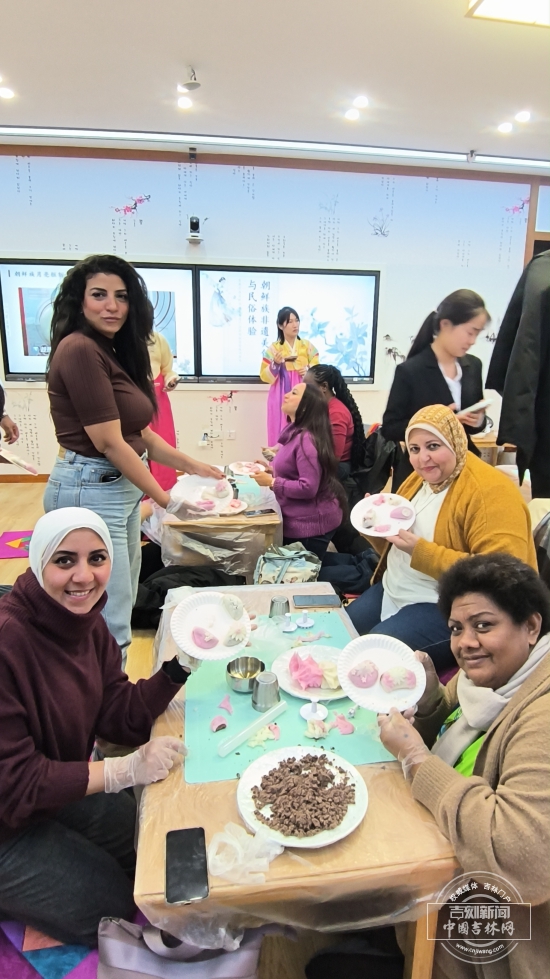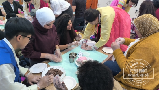 朝鲜族民俗非遗体验馆内,学员们兴冲冲地穿上朝鲜族服饰拍照合影,并亲手制作米糕。