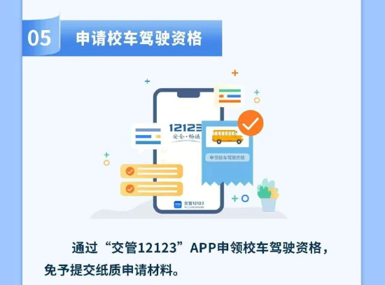 符合条件的驾驶人申请校车驾驶资格,无需提交纸质材料,通过“交管12123”App提交申请后,交管部门在线核查资质,审核通过后直接签注并邮寄新证。现已累计办结27笔申请,助力校车服务高效运转。
