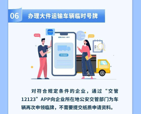 规范运营的大件运输企业,可通过“交管12123”App为已申领过临牌的车辆再次申领,全程无需纸质材料。现已累计办理117笔业务,切实降低企业办事成本。
