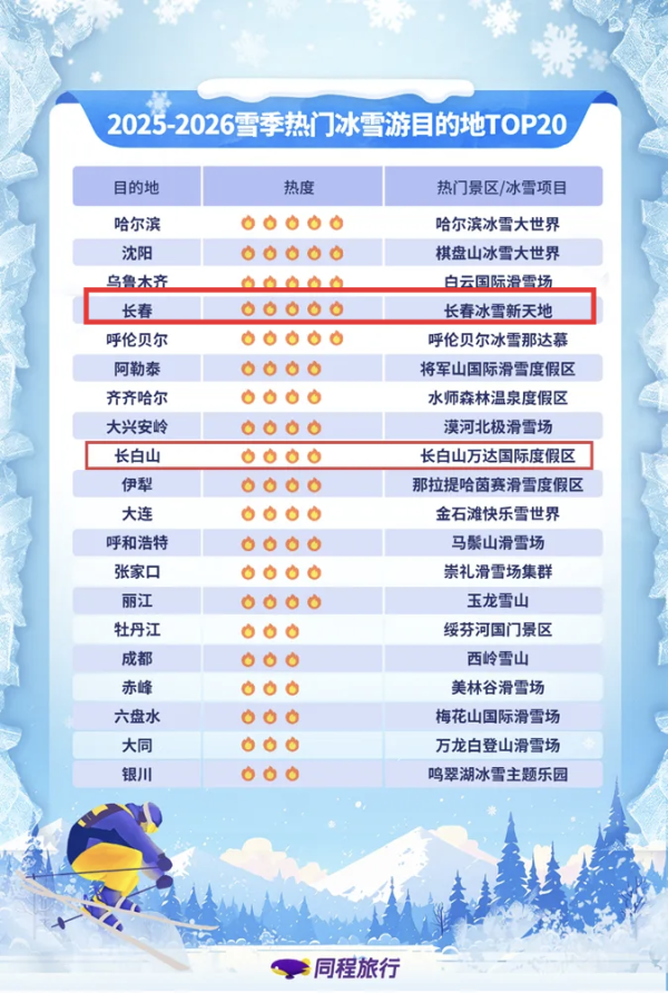 近日,同程旅行发布《2025-2026雪季冰雪游趋势报告》,长春、长白山强势跻身全国热门冰雪游目的地TOP10!这个冬天,吉林把浪漫与欢乐打包奉上,不管是想体验滑雪的畅快,还是想沉浸在冰雪仙境里,来就对了!