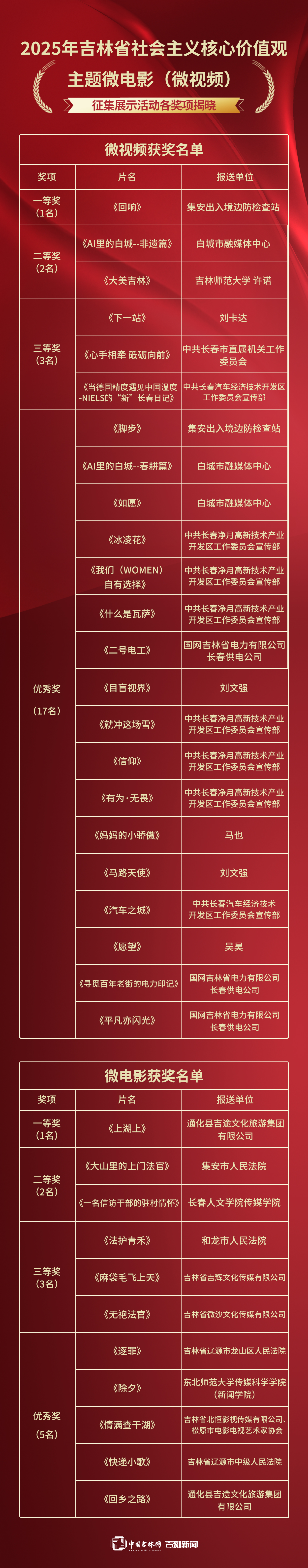 2025年吉林省社会主义核心价值观主题微电影(微视频)征集展示活动自今年6月启动以来,收到来自全省各地的众多优秀作品,内容涵盖“振兴吉林,共绘幸福画卷”“法治吉林,共建和谐家园”“厚德吉林,共筑精神高地”三大主题系列,生动展现了吉林人民爱国敬业、诚实守信、团结友爱的精神风貌。