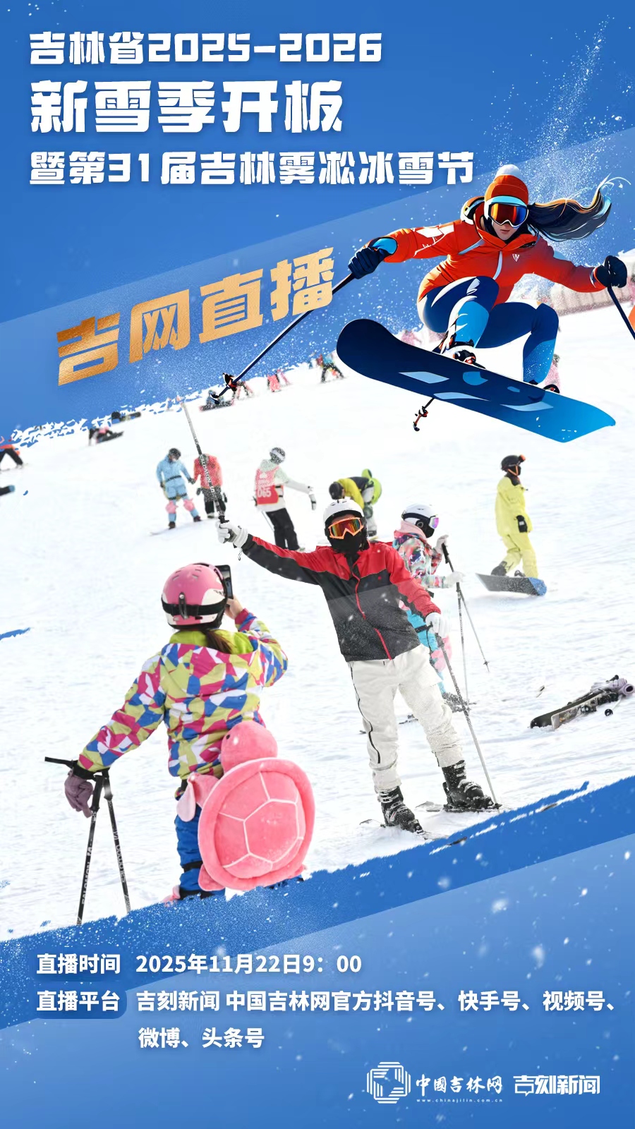 吉林省2025-2026新雪季开板暨第31届吉林雾凇冰雪节开幕式将于今天(11月22日)举行。央视新闻频道将对开板活动进行直播,人民网、新华网将对开幕式进行网络直播,吉祥新闻、省政府门户网站、“吉林发布”政务新媒体平台、彩练APP、吉刻、"吉事办"小程序将全程直播,敬请关注。