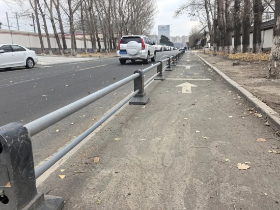 为保障行人安全,在施工结束前,采取临时处置措施:利用道路西侧停车泊位空间加装机非隔离护栏,设置行人通道;制作交通标志和临时取消停车泊位公告牌,将于本周内现场安装完毕。