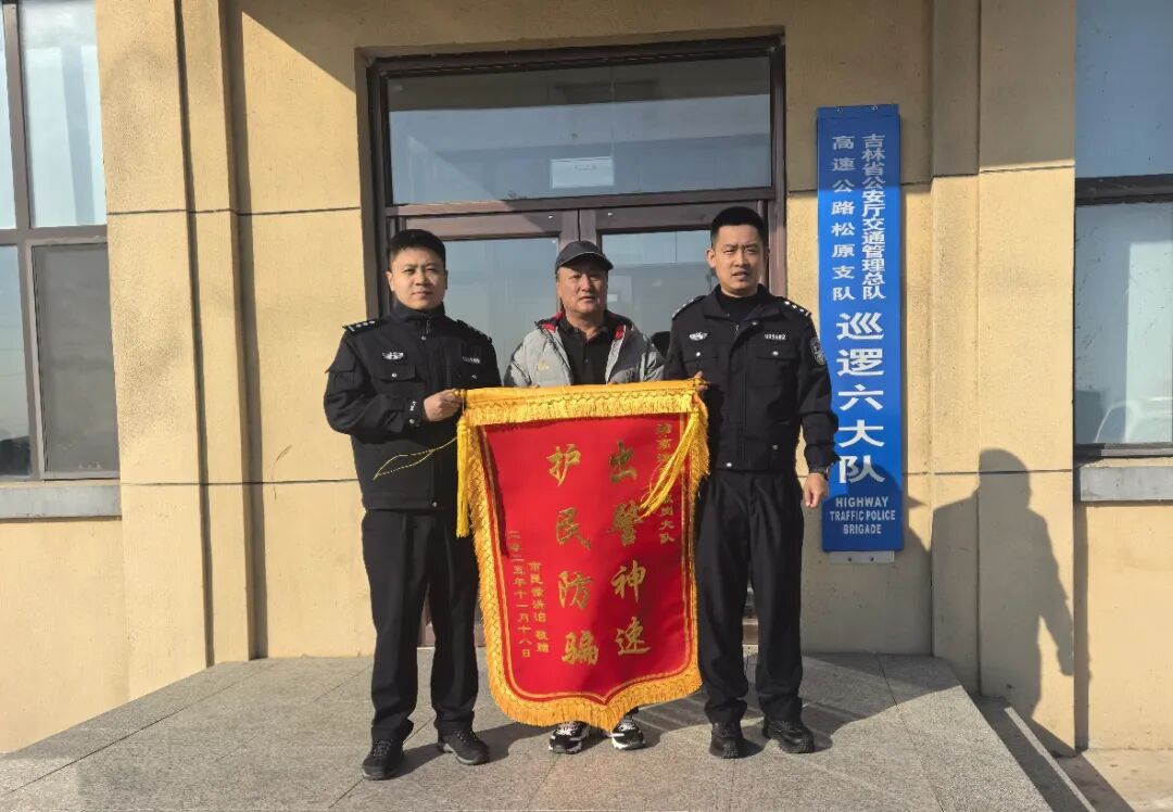 "没有你们,我们家的六万元积蓄就被骗走了!太感谢你们了!”事后,家属专程将印有“出警神速 护民防骗”的锦旗送到高速公路松原支队巡逻六大队,再次向民警当面表达感谢,用最朴实的方式,传递对民警护民财产安全的认可与敬意。