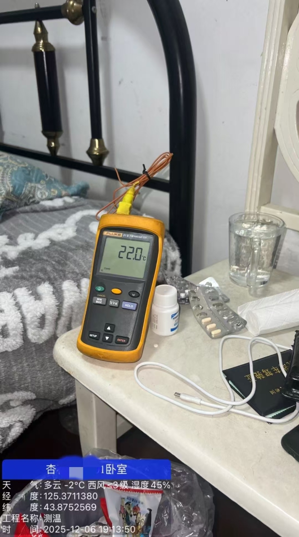 当晚,福安事业部工作人员来到用户李先生家中测温并为暖气放气。经实际勘查,该区域供、回水进户管道温度正常,专业测温仪器显示李先生家卧室室内温度22℃,客厅室内温度 21.9℃。