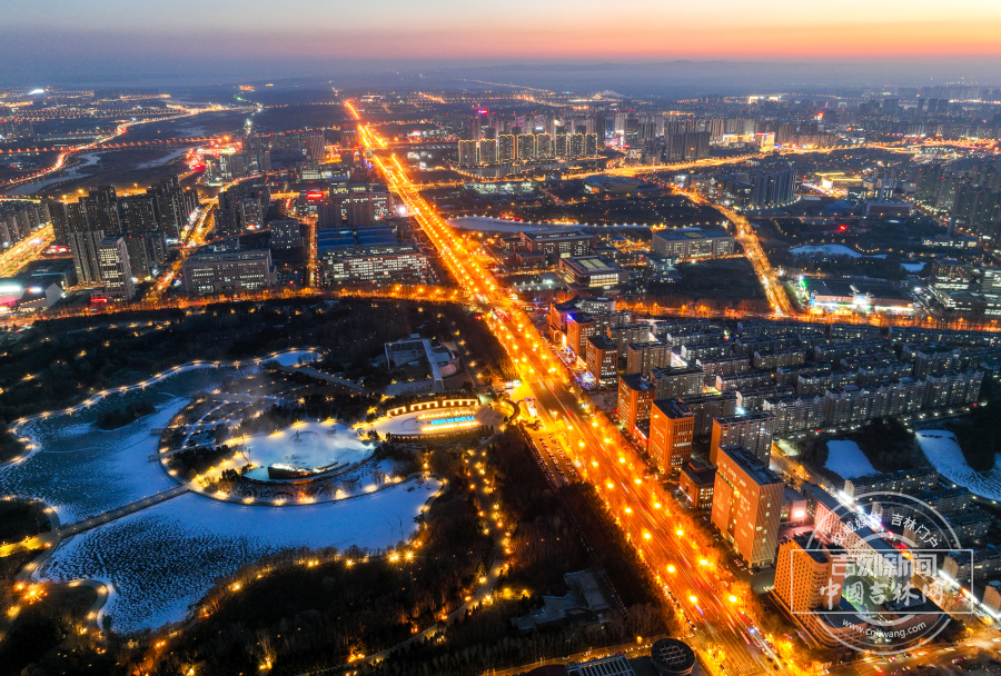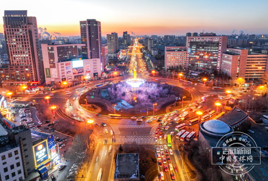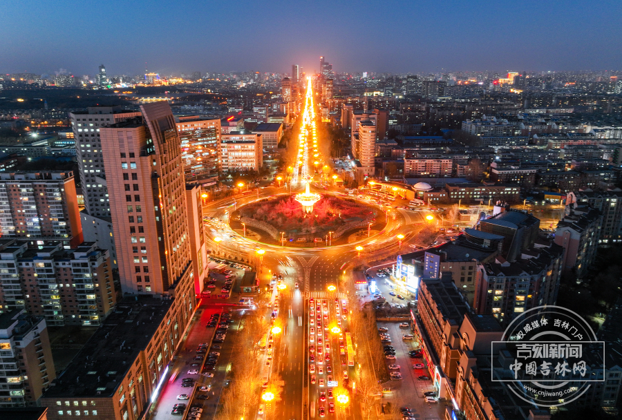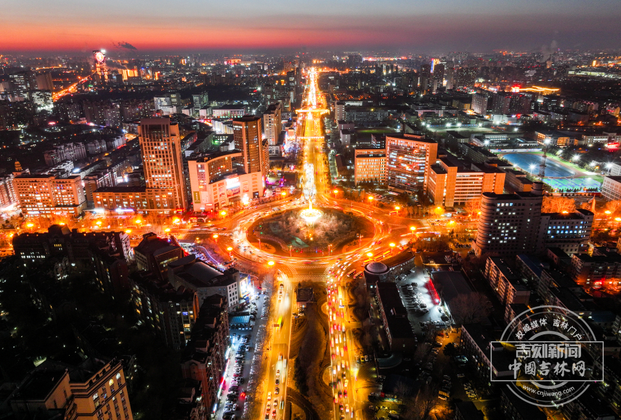 夜幕降临,长春卫星广场华灯初上,车流如织,霓虹闪烁,卫星广场宛若繁星,城市街灯与天际线相映,尽显春城灵动夜色。
