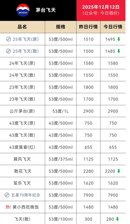 据“今日酒价”平台数据显示,飞天茅台价格已持续下行近一年。以53度500毫升飞天茅台(原)为例,今年初价格约为2220元/瓶,至12月12日已降至约1495元/瓶,累计跌幅超过30%。