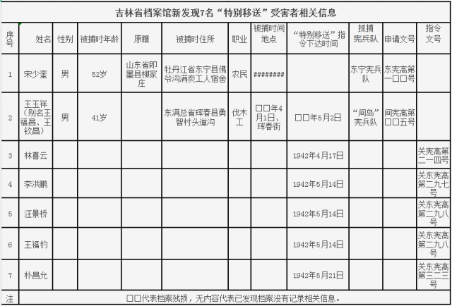 按照日本关东宪兵队司令部的规定,抗日人员、从事地下工作的情报人员,以及普通平民,只要被认定为“没有利用价值”的人员都被纳入移送范围,其中抗日人员为其重点目标。档案明确记载,原八路军战士苏长峰,原东北抗联战士李基洙、许春甫、郭喜山,原中共地下工作人员王玉祥、高维金等均被日本关东宪兵队判定为“没有利用价值”而成为“特别移送”对象。在日军眼中,这些鲜活的生命不过是可随意处置的“实验耗材”。