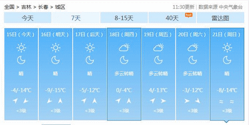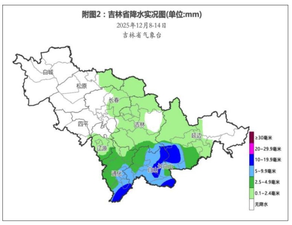 15日,辽源东部(东丰)、通化北部(辉南、梅河口、柳河)、白山、长白山保护开发区有小雪,吉林南部(桦甸、磐石)、延边南部(和龙、龙井) 部分地方有小雪;