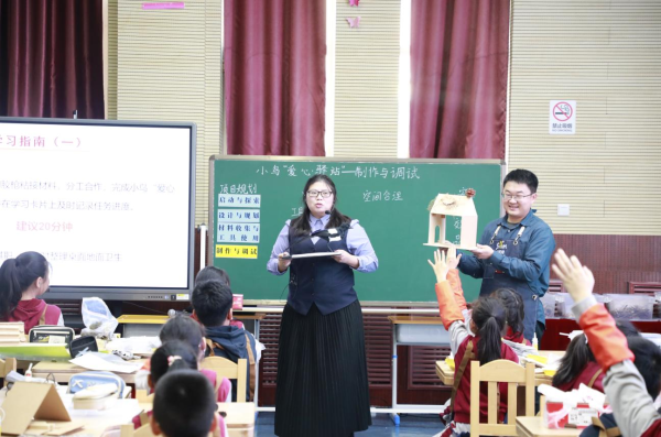图为工作室成员柴进延和王博老师共同呈现的《制作小鸟“爱心驿站”》课例