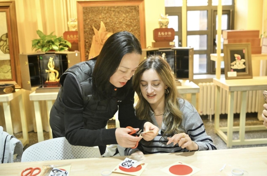 在礼遇吉林店内,外媒记者对人参、鹿茸等吉林特产和非遗鱼皮画表现出浓厚兴趣,部分人员还亲手体验了鱼皮画制作。