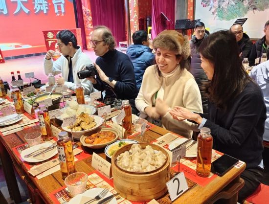 “饺子是代表中国传统节日的一种食物,往往承载着温暖的记忆。”来自美国的自媒体博主于中美端起蒸饺向镜头展示着。除了招牌蒸饺,金黄酥脆的锅包肉、绵柔香甜的雪衣豆沙等地道吉菜陆续上桌,成为采风团成员们镜头下的主角。